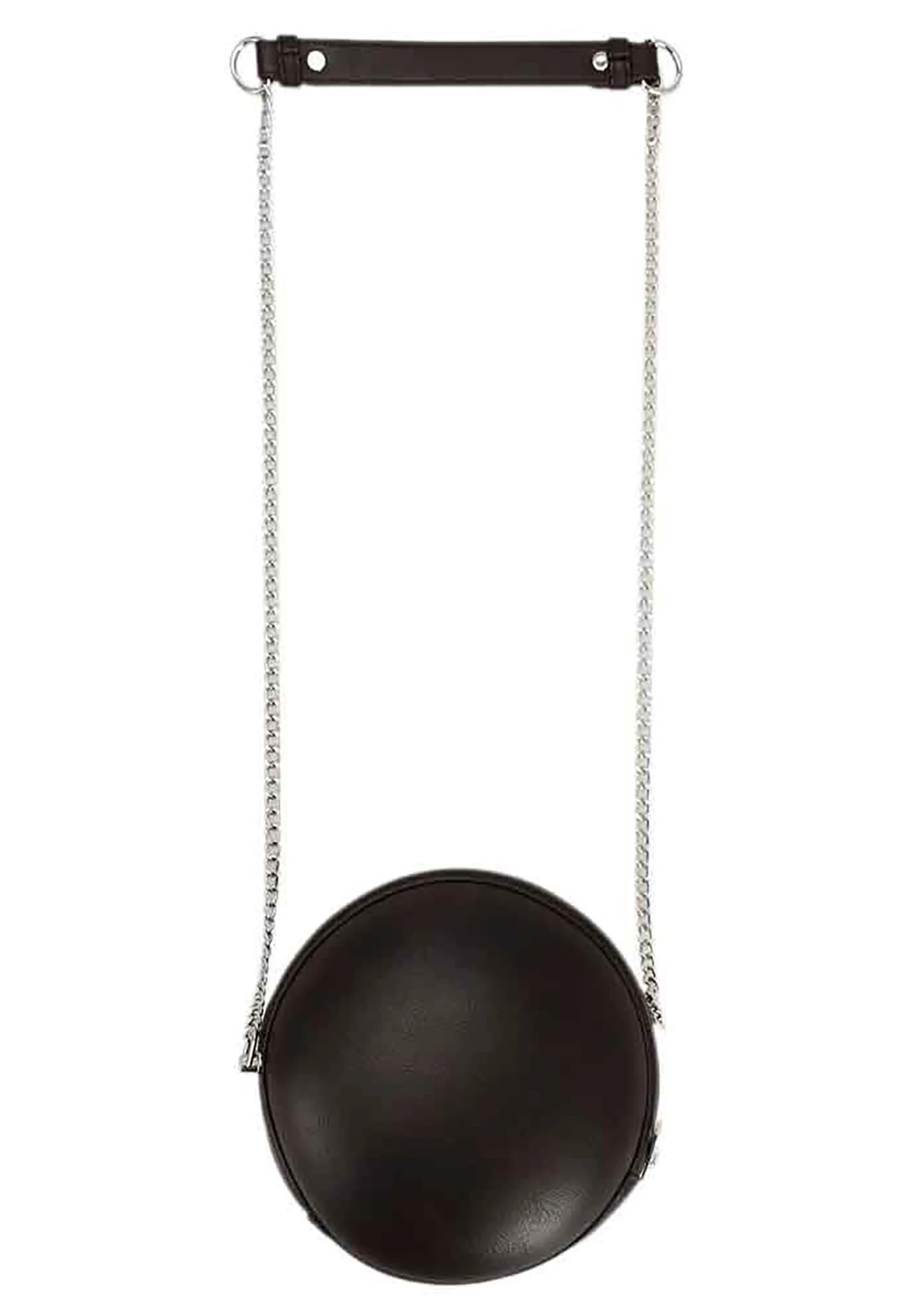 - Hard, round bag has an attached chain strap