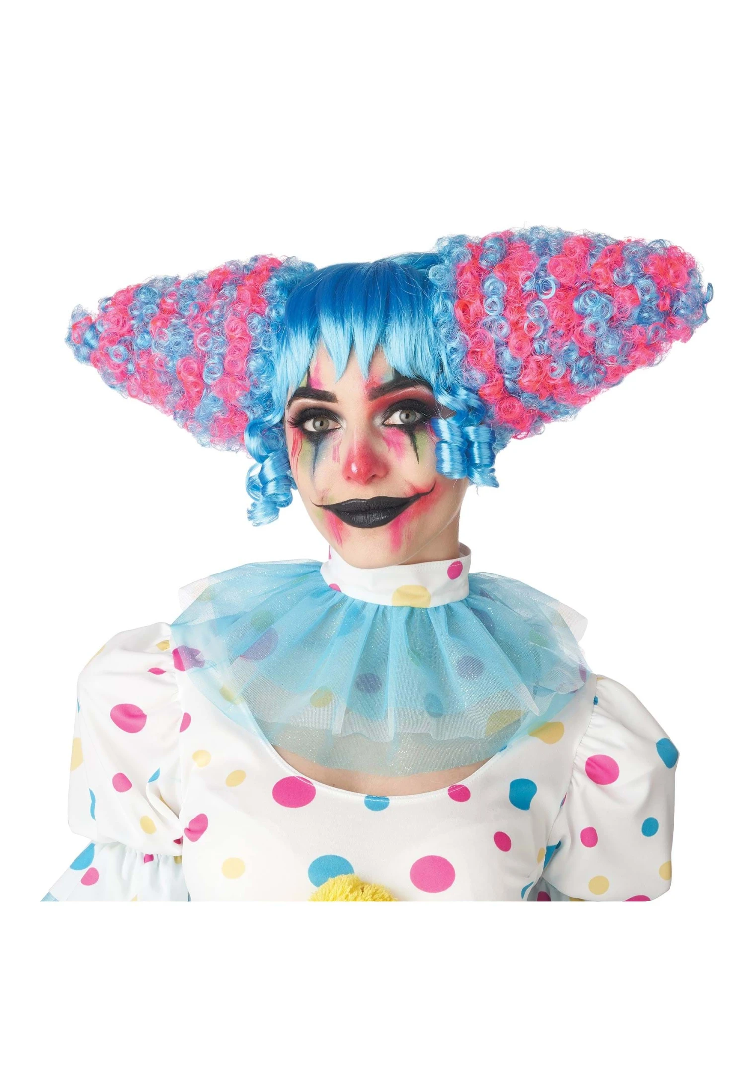 - Wig hair is styled and looks like cotton candy