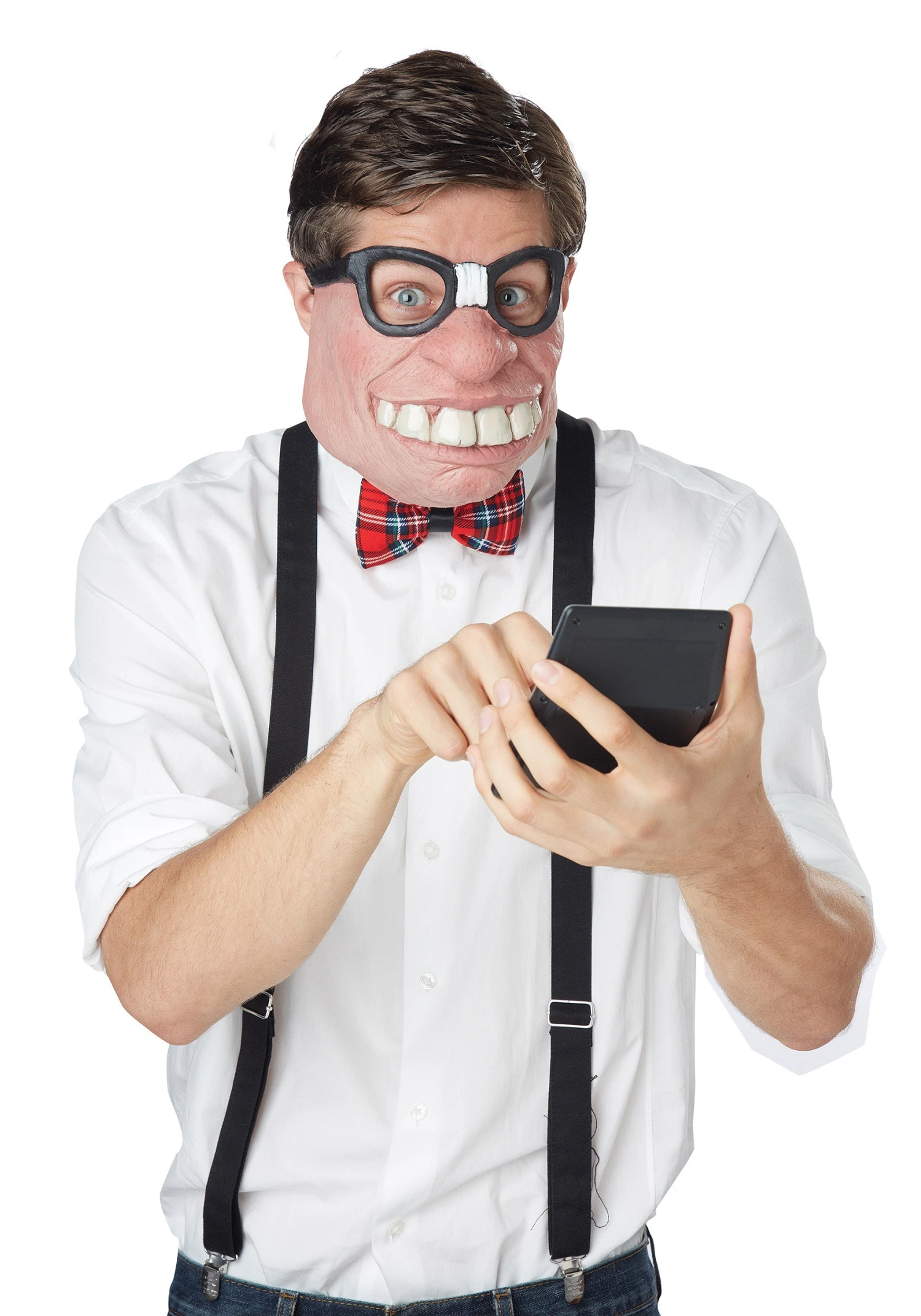 Some masks make you cringe in fear, other make you smile. This mask kinda just makes us feel a little..weird. We giggle for awhile and then we just have to look away. If you are looking to let out your inner geek with a goofy nerdy look, don’t go through all the trouble of altering your appearance. Get in the mind of a geek and work smarter, not harder. Why deal with all the hassle when you can just wear this unique Geeked Out Mask?