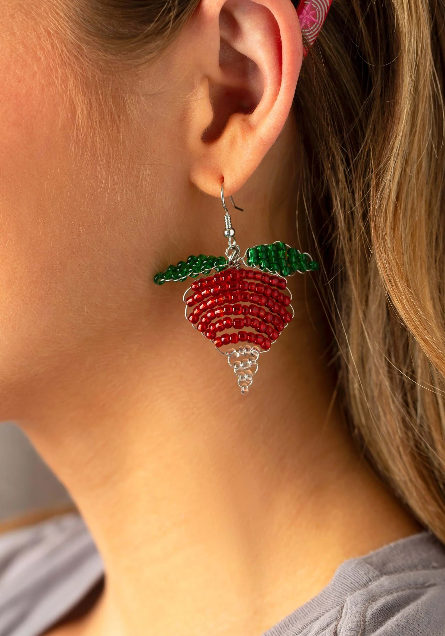 - Beaded earrings have fishhook findings for pierced ears