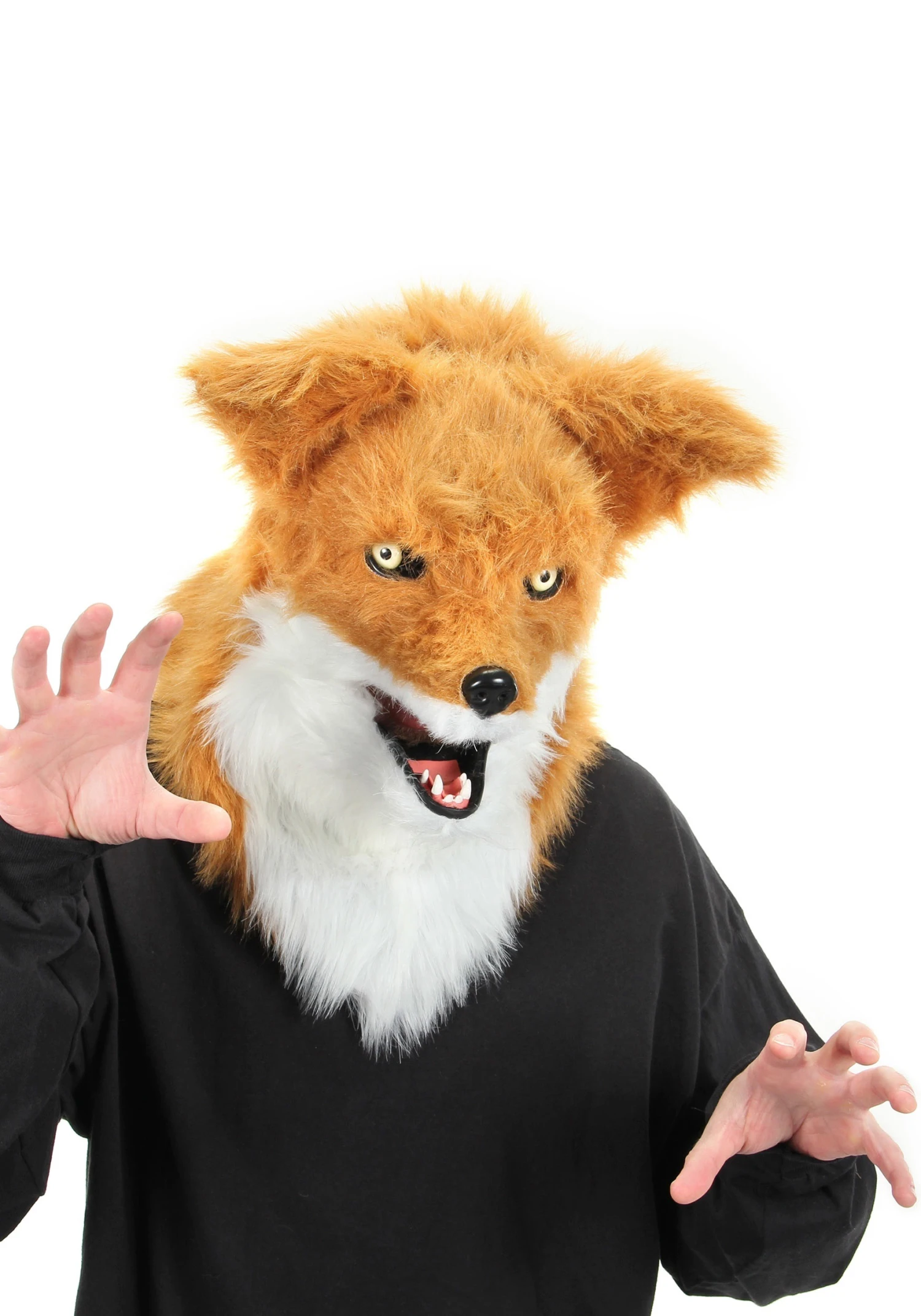 The eye openings have mesh coverings to keep your identity secret while you can see out. This Mouth Mover Fox Mask is a fake fur-covered plastic mask with a felt and mesh lining and soft, sculpted ears. The mask is held in place by an elastic band.