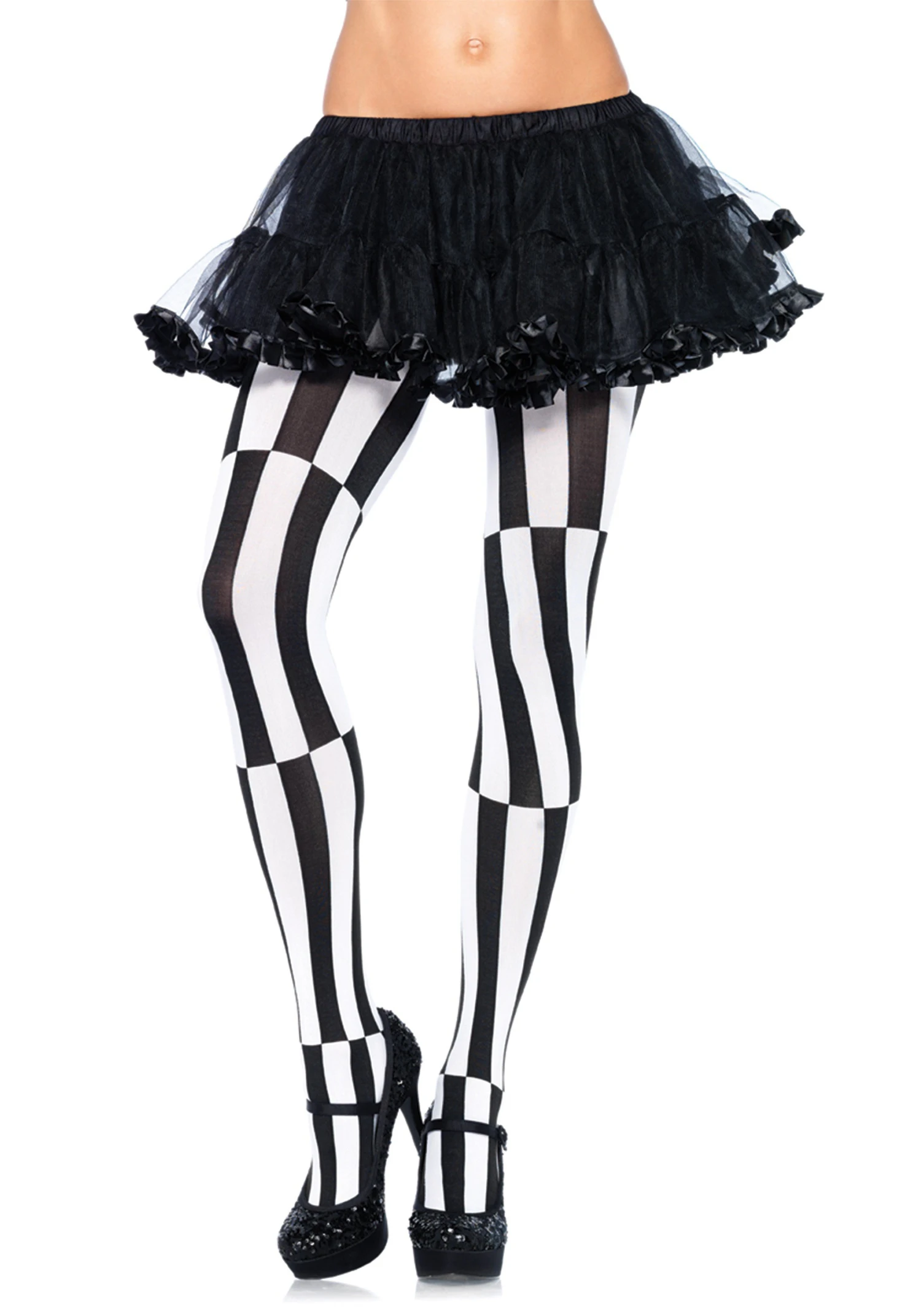 Right! So watch your pals do a double-take when you strut into the party scene wearing these zany Striped Optical Illusion Tights. This awesome accessory has a trippy look that will trick your onlookers’ eyes with its mismatched black and white stripe pattern. They go great with tons of different costumes and petticoats, and can even pair with a little black dress for a funky night on the town. So be a goofy trickster, beautiful work of art, or a crazy mime this Halloween. Crafting an eye-catching, bold look has never been so easy. Add these alluring tights to your costume and enjoy a night of fun!