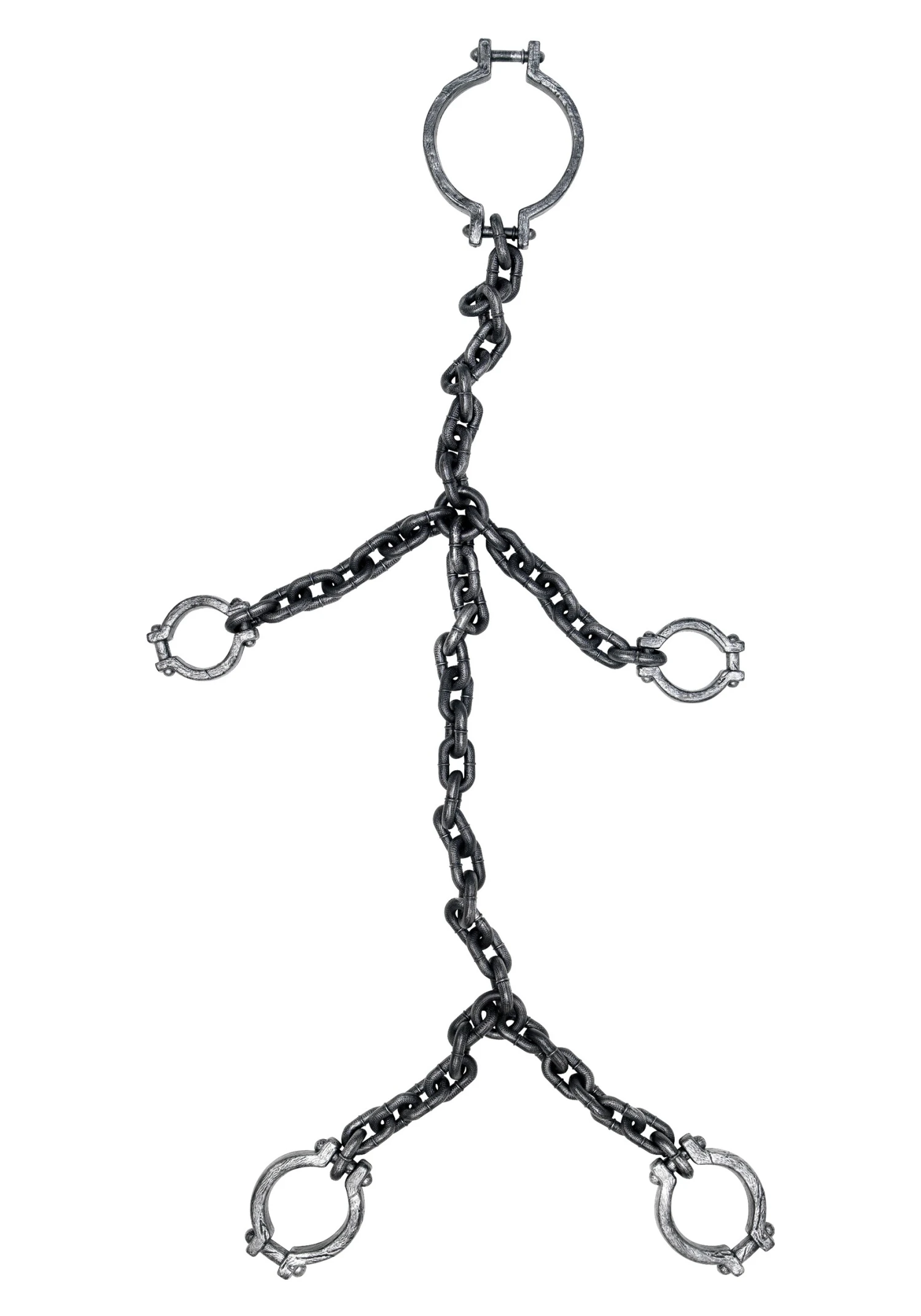 - Attached molded plastic shackles fit around neck, wrists and ankles